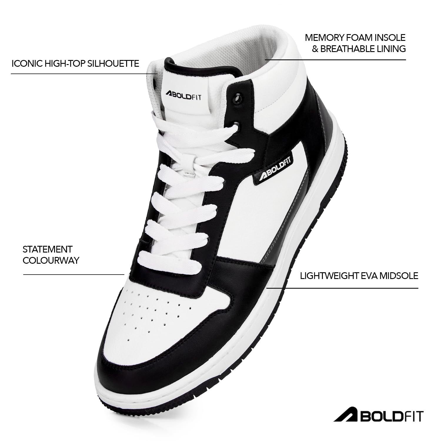 Boldfit introducing the ZeonX mens High-Top Sneakers. Command attention with a premium PU leather upper and ankle-hugging design, offering enhanced support and a bold, stylish look. The Lycra lining provides a supremely soft, irritation-free, and snug fit, ensuring all-day comfort. Engineered for durability, the lightweight TRP sole delivers superior cushioning and reliable shock absorption, perfect for street style or your gym workout. A high-performance rubber outsole guarantees exceptional grip and stability on any terrain, enhancing ankle security. These versatile high-top shoes are ideal for active daily routines, blending durable function with a dominating fashion statement. The ultimate sneaker shoes for men. Elevate your presence and comfort.
